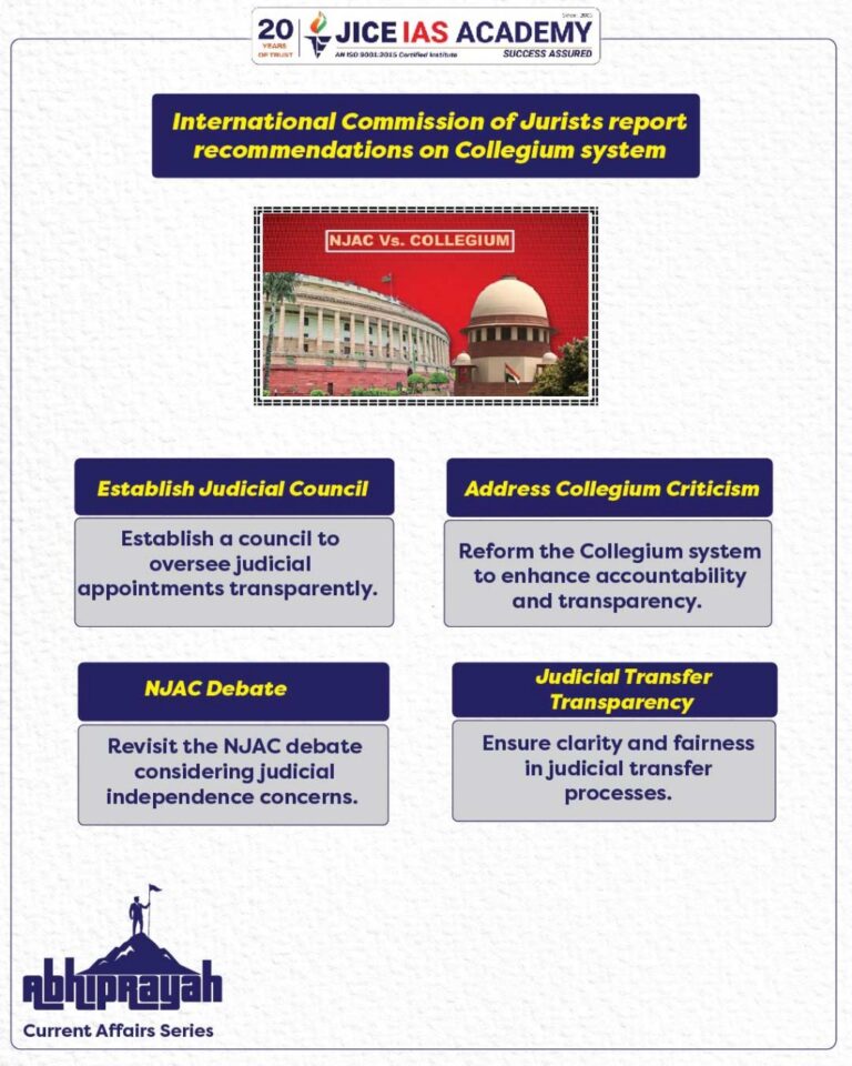 The International Commission of Jurists (ICJ) has recommended establishing a Judicial Council to oversee judicial appointments and transfers with transparency, amid renewed debates over the Collegium system’s lack of accountability.
