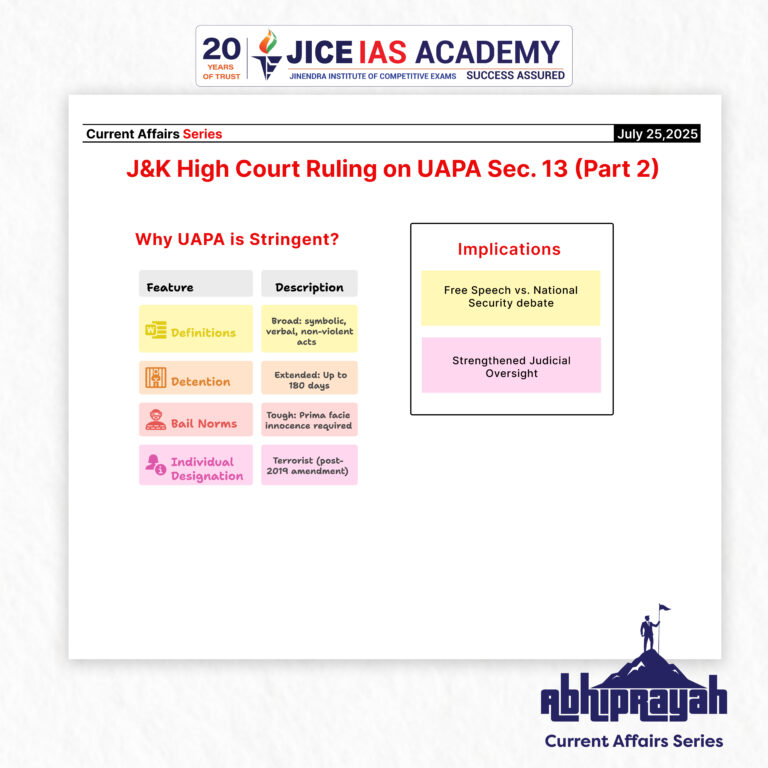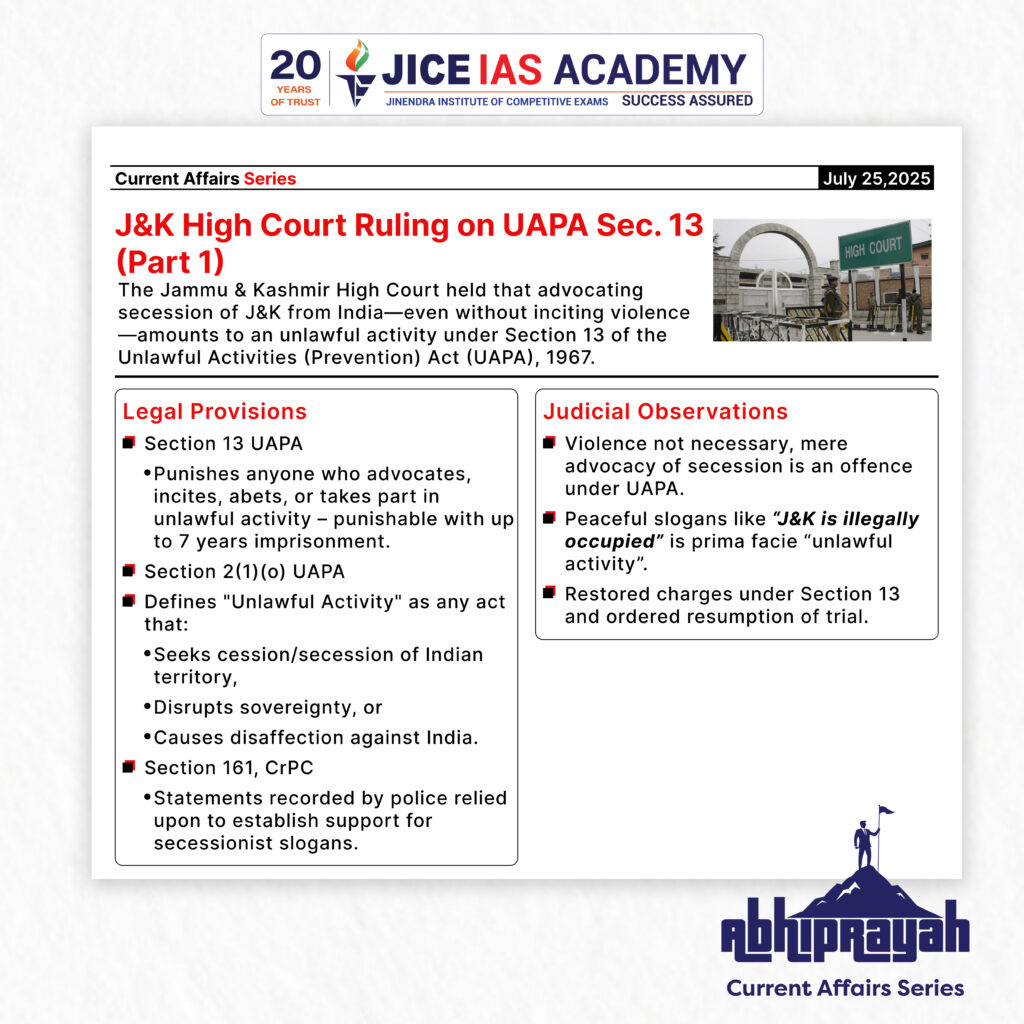 - The Jammu and Kashmir High Court recently ruled that advocating or inciting secessionist views—such as claiming that Jammu & Kashmir is “illegally occupied” and should be separated from India—constitutes an offence under Section 13 of the Unlawful Activities (Prevention) Act (UAPA), 1967.