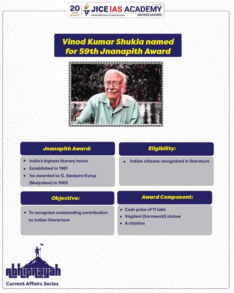 - Eminent Hindi writer Vinod Kumar Shukla has been conferred the 59th Jnanpith Award, India’s highest literary honor, in recognition of his simplicity and sensitivity in writing.