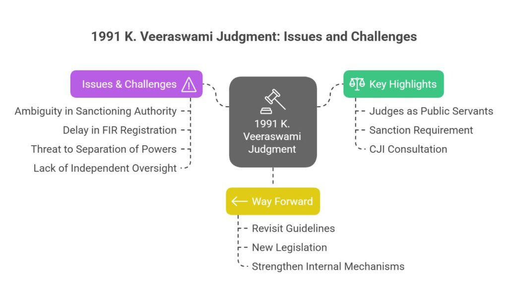 - The mandatory requirement to consult the Chief Justice of India (CJI) before even registering an FIR against a sitting judge leads to procedural delays.