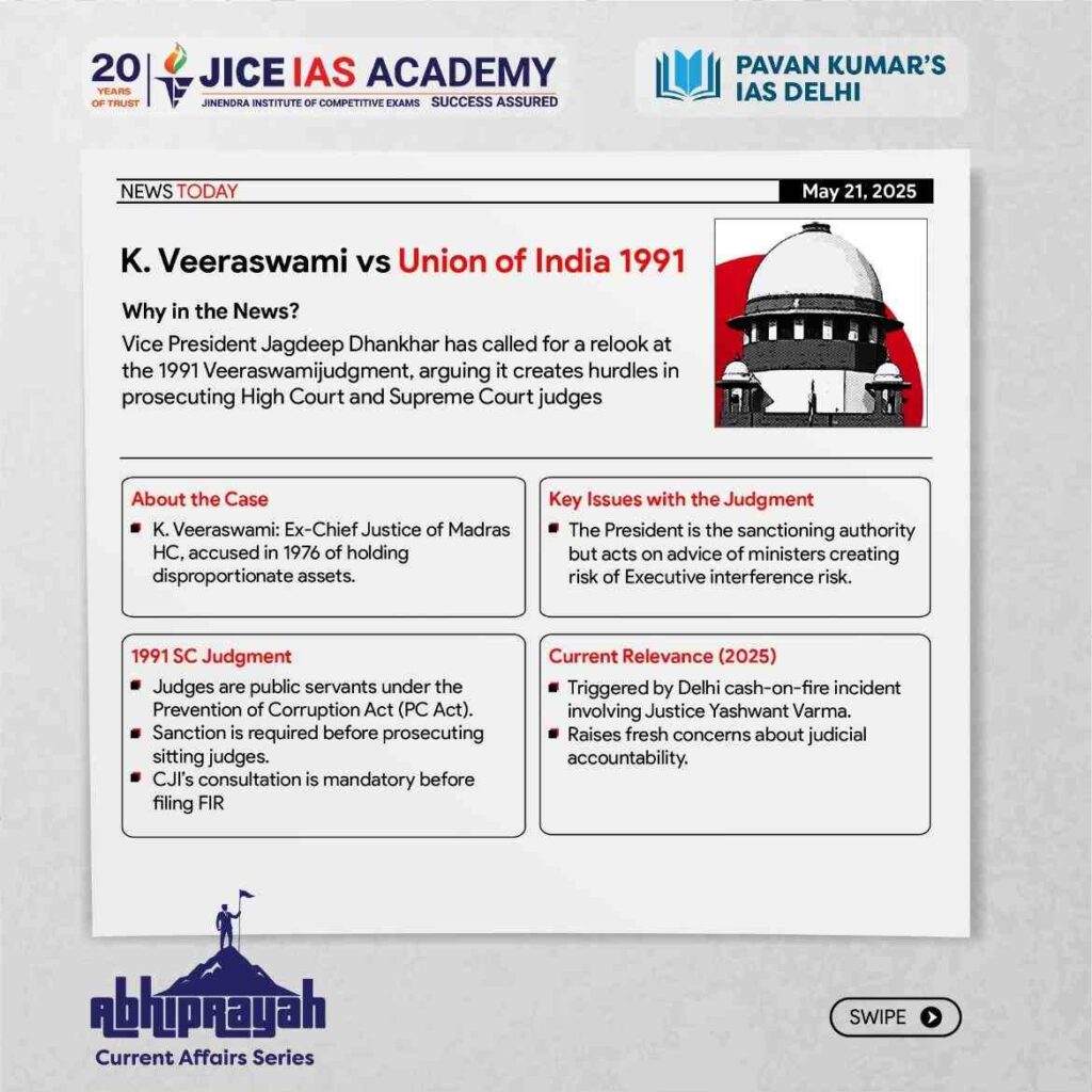 Vice President Jagdeep Dhankar has called for revisiting the 1991 K. Veeraswami vs Union of India judgment, citing it as the origin of judicial corruption and a hurdle to registering FIRs against High Court and Supreme Court judges.
