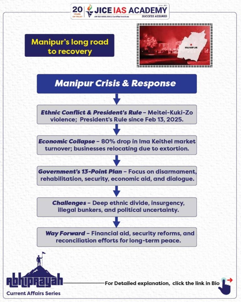 The Manipur crisis, marked by ethnic violence between Meitei and Kuki-Zo communities, led to President’s Rule, with the government implementing a 13-point roadmap for peace, disarmament, and economic recovery.
