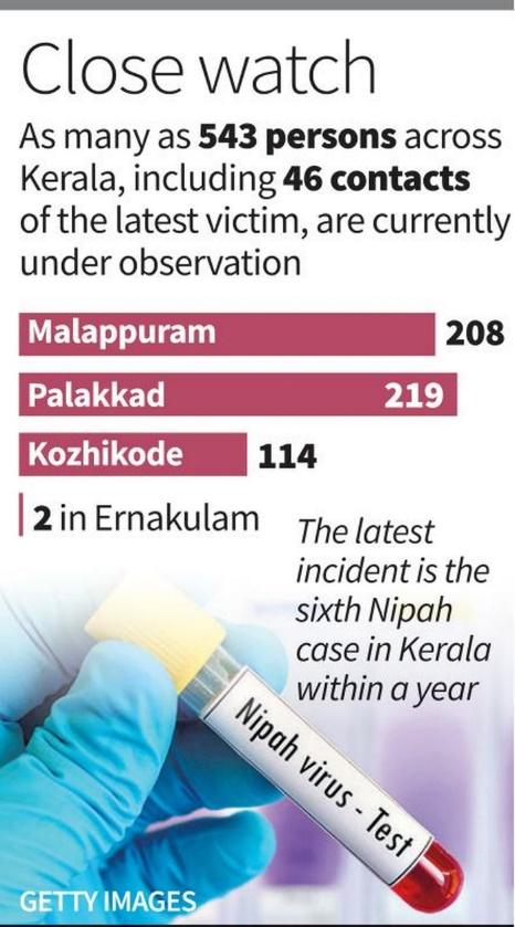 - Even before the official confirmation of Nipah infection from the National Institute of Virology (NIV), Pune, health authorities across Palakkad and Malappuram districts had proactively begun contact tracing. So far, 46 primary contacts of the deceased patient have been traced, and a comprehensive surveillance network has been activated.