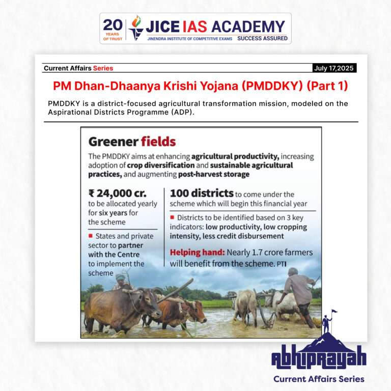 - The Union Cabinet approved the Prime Minister Dhan-Dhaanya Krishi Yojana (PMDDKY), a comprehensive initiative aimed at enhancing agricultural productivity, promoting sustainable practices, and improving the resilience of India’s agricultural sector.