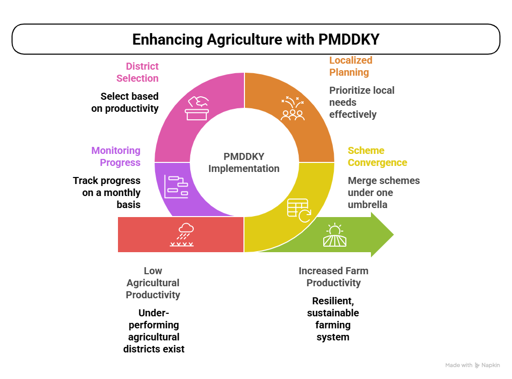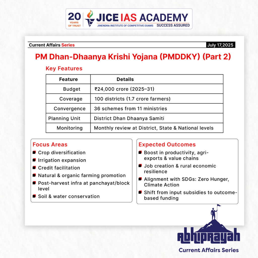 - Agricultural Transformation: PMDDKY marks a structural shift from fragmented schemes to a unified, outcome-driven model.