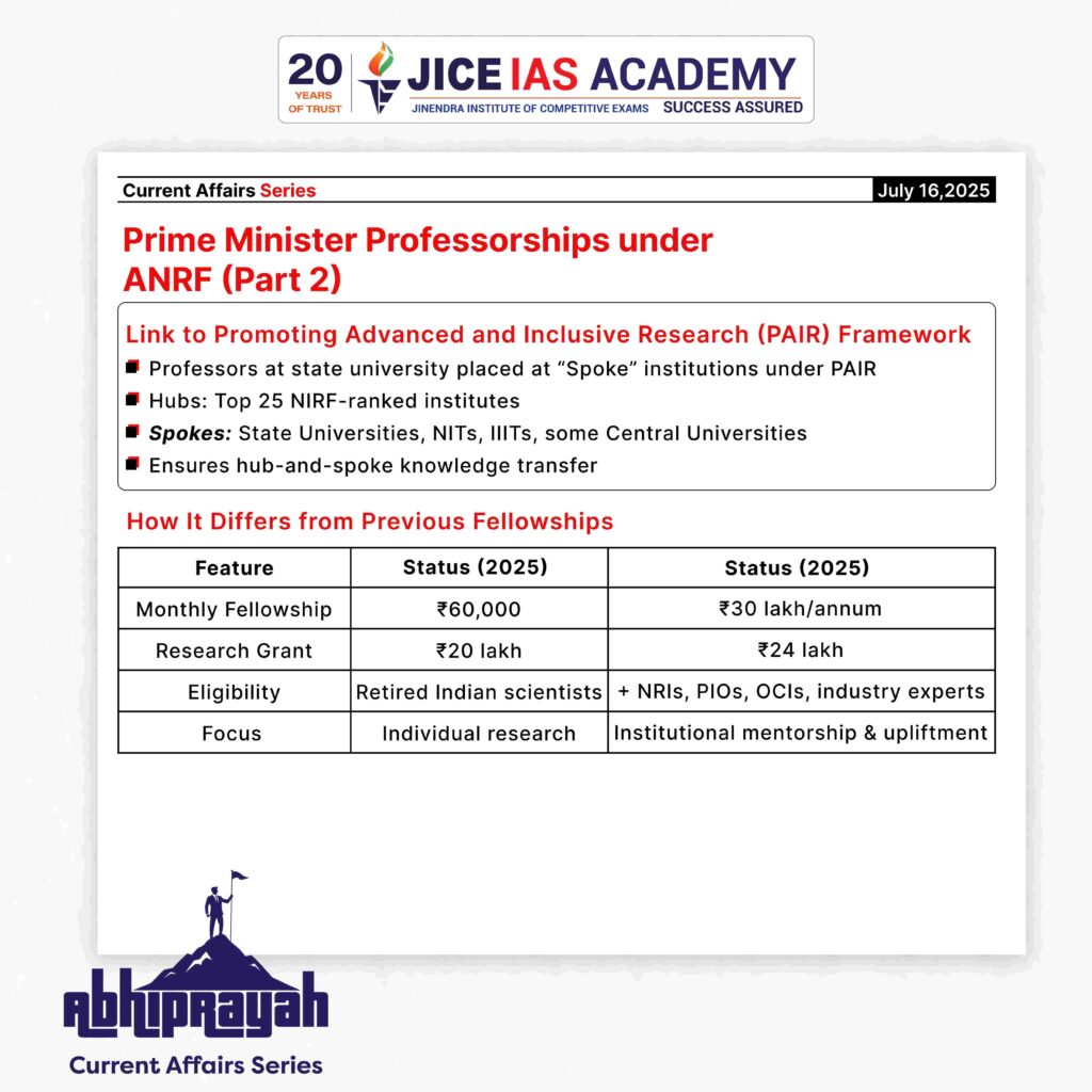 - The Prime Minister Professorships mark a paradigm shift in India’s research funding model, focusing not only on excellence but also on inclusivity.