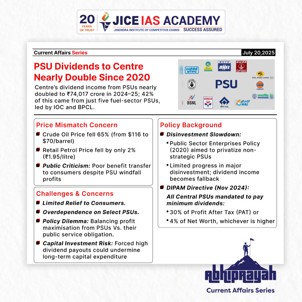 With sluggish disinvestment and higher fiscal needs, the government has turned to enhanced PSU dividends as a revenue source. However, this raises critical questions on the function of PSUs — whether they should serve primarily as revenue generators or continue fulfilling their public welfare objectives, especially in key sectors like fuel and energy. A balanced, transparent, and consumer-sensitive approach will be essential going forward.