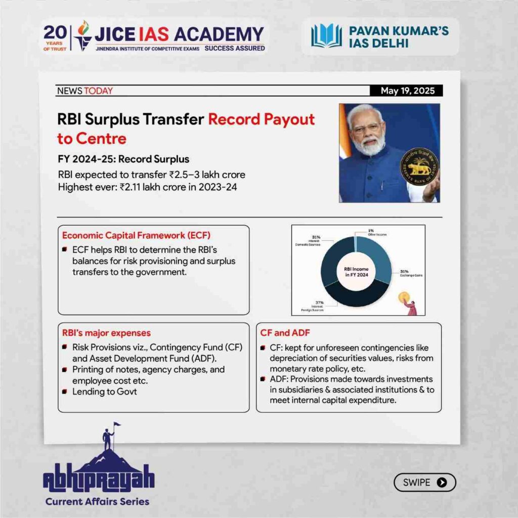 - The Economic Capital Framework (ECF) is a mechanism used by the RBI to determine how much risk provisioning it needs to maintain (to safeguard against potential financial shocks) and how much surplus (profit) it can transfer to the government.