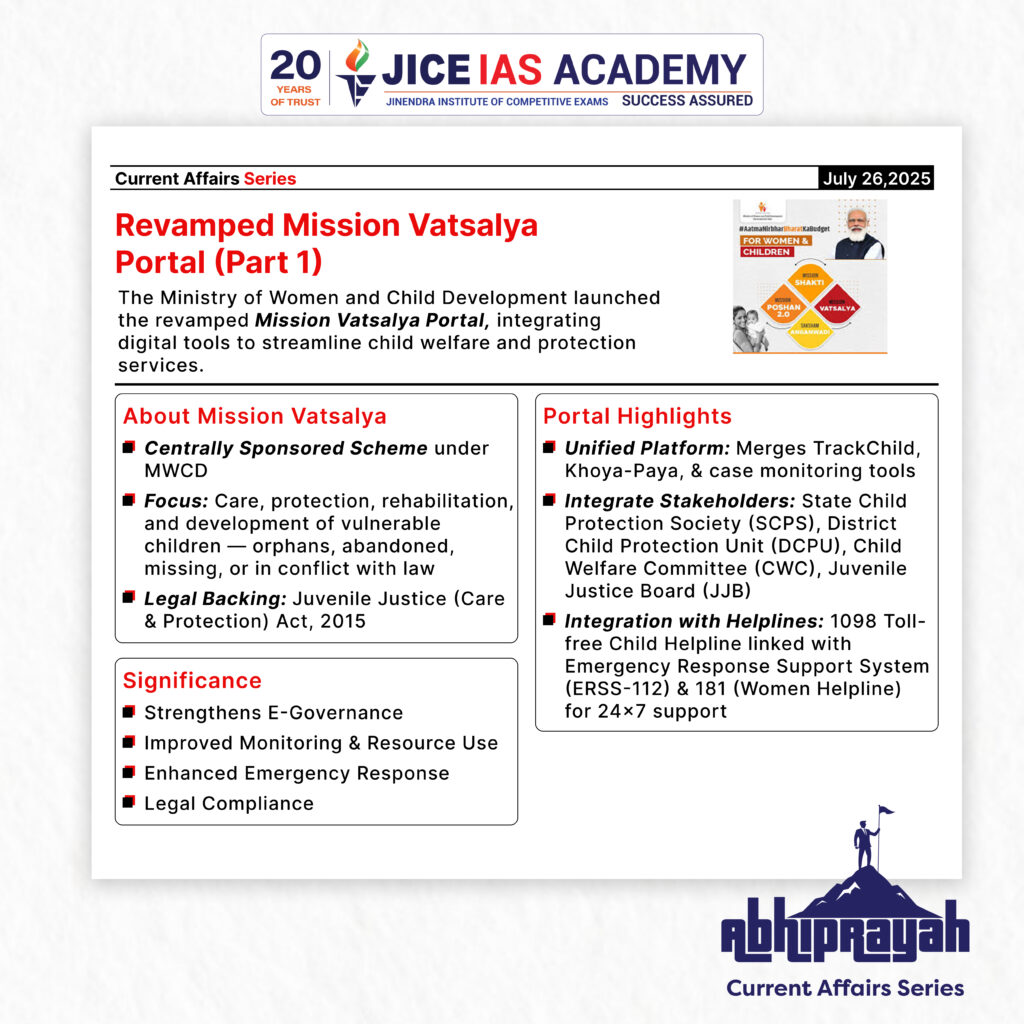 The revamped Mission Vatsalya Portal is a landmark step in the digital transformation of India’s child protection framework. By unifying stakeholders on a single platform, it holds the potential to radically improve child safety, rescue, and rehabilitation mechanisms, contributing to the constitutional vision of protection of child rights and inclusive governance.