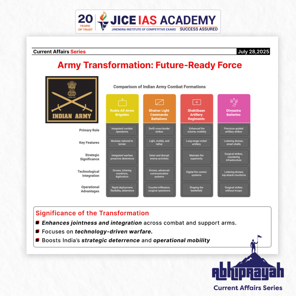 - They are being formed as part of the Indian Army’s transformation towards a lean, agile, and technology-driven force.