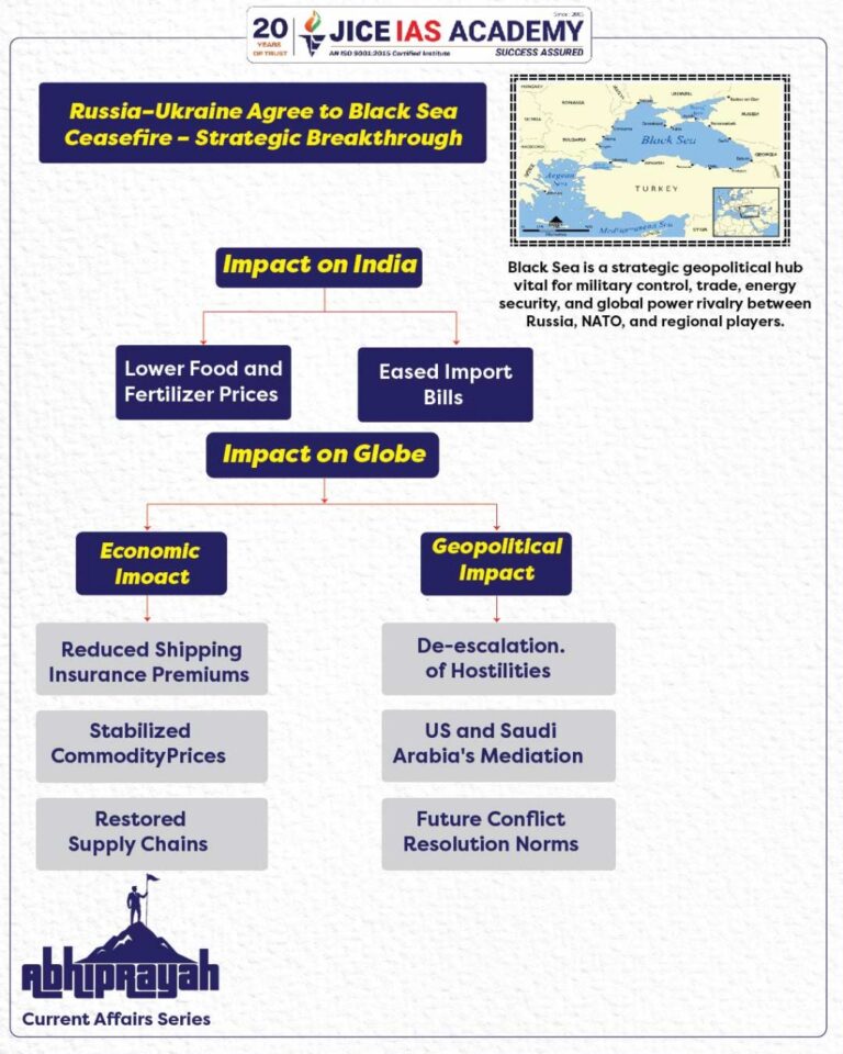 The Russia–Ukraine Black Sea ceasefire represents a rare breakthrough in a prolonged and destructive conflict. While fragile, it offers a window of opportunity for diplomatic engagement, humanitarian relief, and economic stabilization. For India and the global community, the agreement could mark the beginning of rebuilding trust, restoring supply chains, and reimagining multilateral peace efforts in a shifting world order.