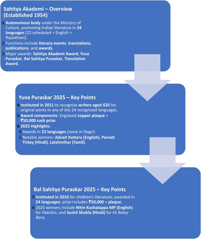 - The Yuva Puraskar and Bal Sahitya Puraskar are not merely awards but instruments of cultural policy.