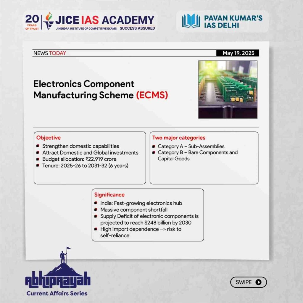- The Government of India launched the Electronics Component Manufacturing Scheme (ECMS) on May 1, 2025, with a financial outlay of ₹22,805 crore.