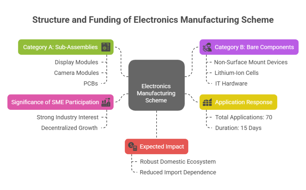 - The scheme is designed to strengthen India’s domestic capabilities in the manufacturing of electronic components and sub-assemblies, thereby reducing reliance on imports and supporting the goal of self-reliance under the Atmanirbhar Bharat initiative.
