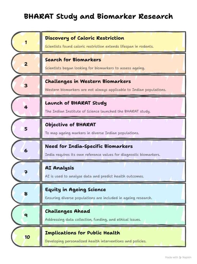 - The BHARAT study by IISc Bengaluru aims to create India-specific biomarkers of ageing to better understand and manage healthy ageing in the Indian population.