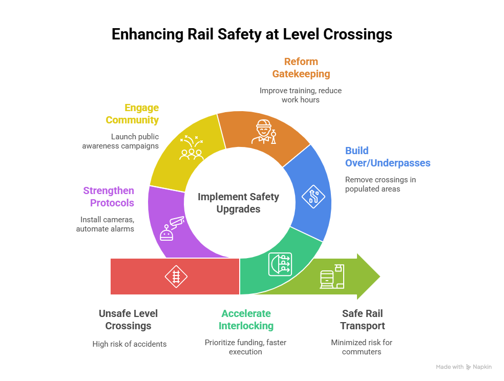- The Indian Railways, in collaboration with state authorities, must fast-track infrastructure upgrades and ensure that safety is never compromised.