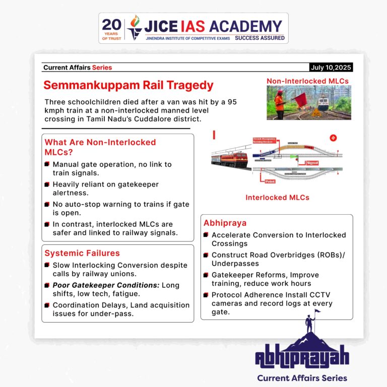 A tragic collision at a non-interlocked manned level crossing in Tamil Nadu’s Cuddalore district on July 8, 2025, exposed serious flaws in India’s railway safety infrastructure, leading to the death of three schoolchildren.