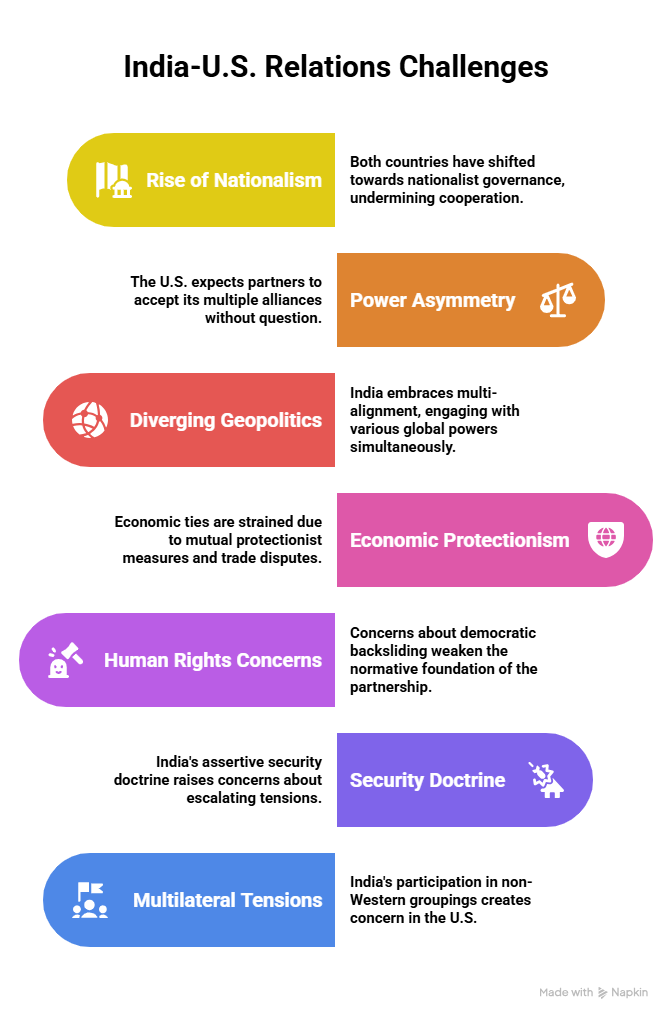 - India-U.S. relations are now facing strain due to rising nationalism, strategic divergence, and unresolved structural tensions.