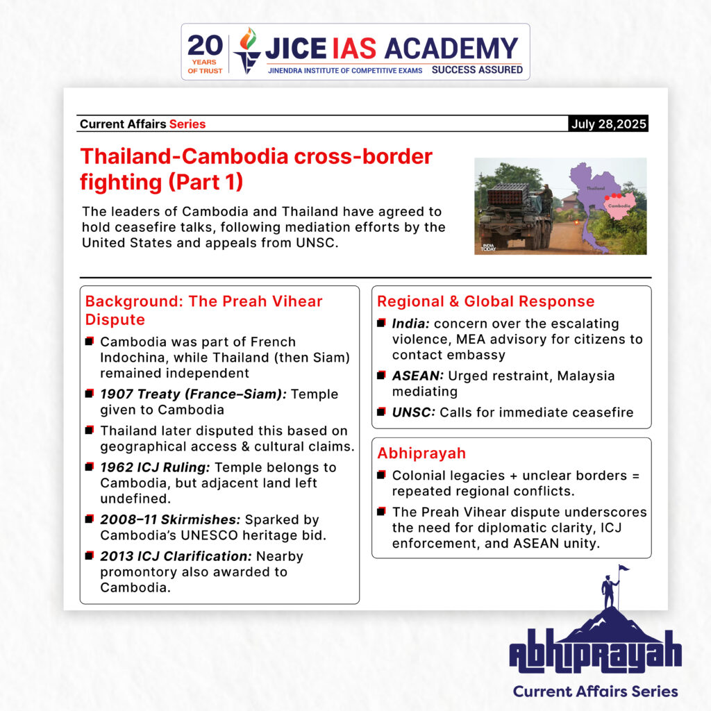 - The Thai–Cambodian conflict over Preah Vihear is emblematic of how colonial legacies, nationalism, and undefined borders can escalate into military confrontation. While the ICJ rulings have helped reduce tensions, the dispute underscores the importance of diplomatic clarity and regional cooperation in Southeast Asia.