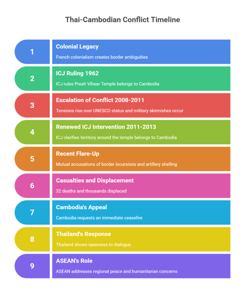 - 2008: Tensions reignited when Cambodia applied for UNESCO World Heritage status for Preah Vihear Temple. Thailand opposed it, arguing it implied sovereignty over disputed land.