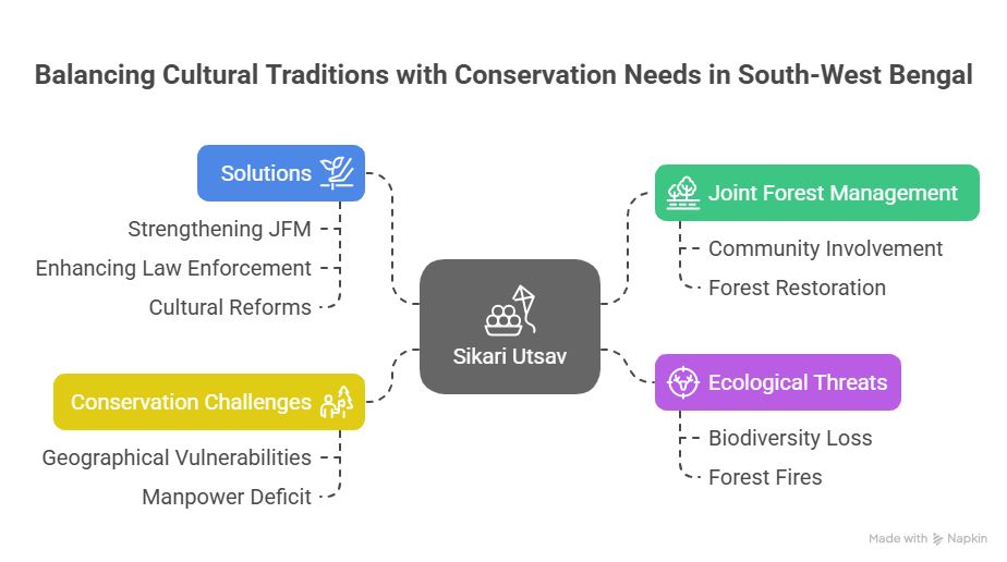 - However, despite these achievements, south-west Bengal faces critical environmental challenges, notably ritualistic hunting during the Sikari Utsav, which poses a threat to fragile ecosystems and undermines conservation efforts.