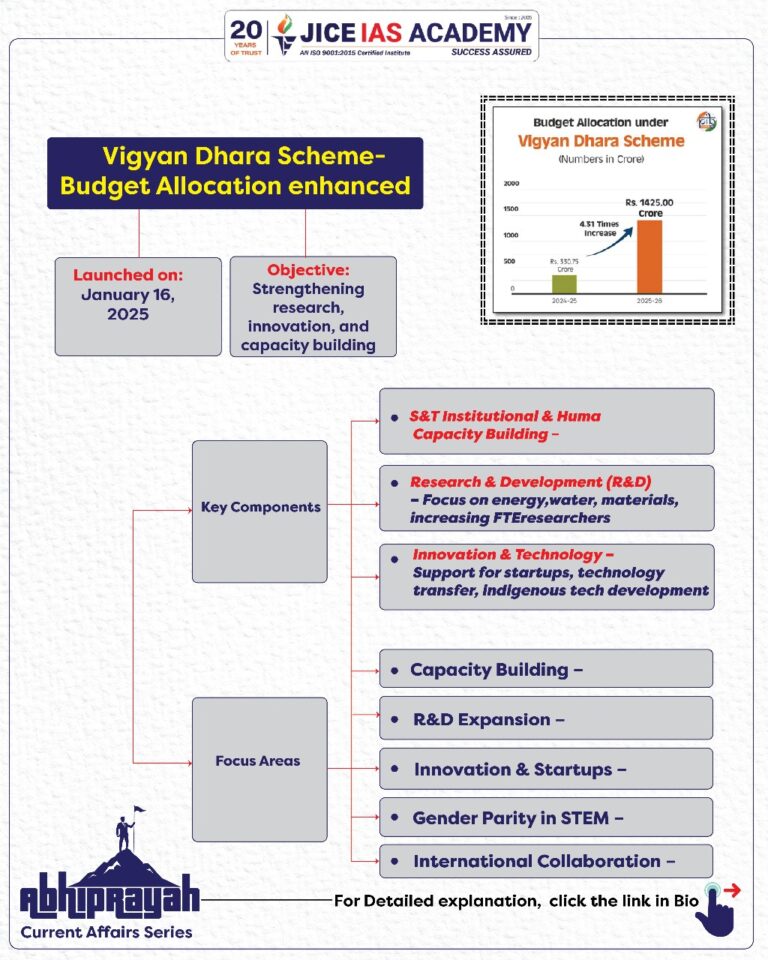 The Vigyan Dhara scheme, launched in 2025, integrates research, innovation, and capacity-building initiatives to strengthen India’s scientific and technological ecosystem, with a budget allocation of ₹10,579.84 crore for 2021-26.