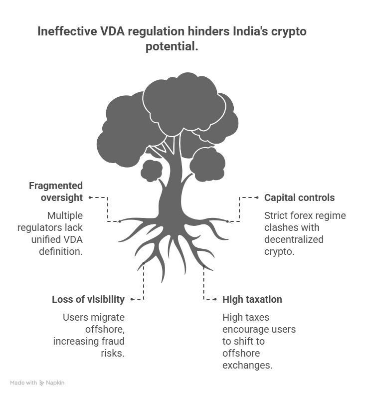 Multiple regulators (RBI, SEBI, FIU, Ministry of Finance) operate without a unified statute defining VDAs or assigning clear jurisdiction. - Capital controls vs. decentralisation