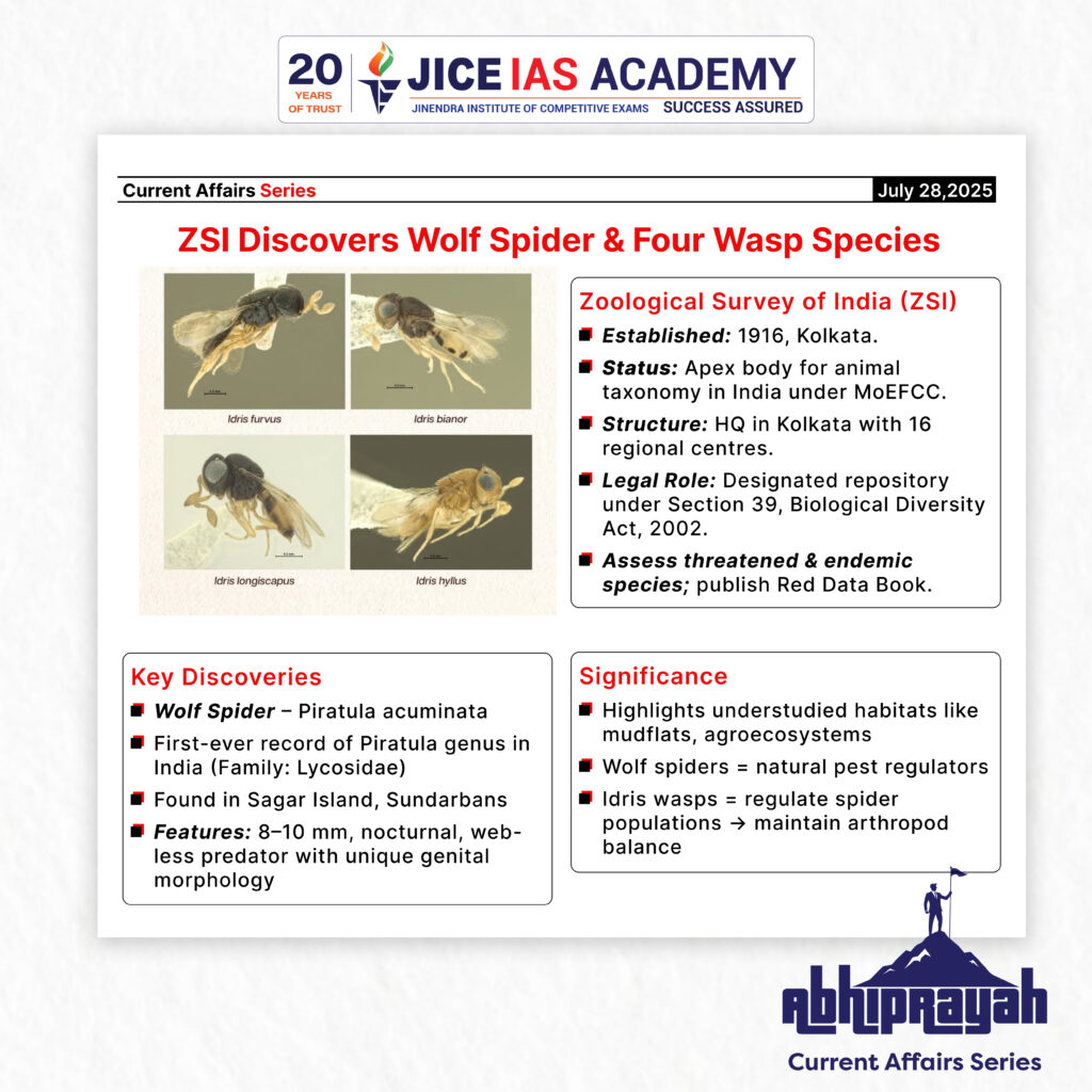 - Zoological Survey of India (ZSI) scientists discovered a new species of wolf spider (Piratula acuminata) from Sagar Island and four new parasitoid wasp species (Idris genus) from West Bengal.